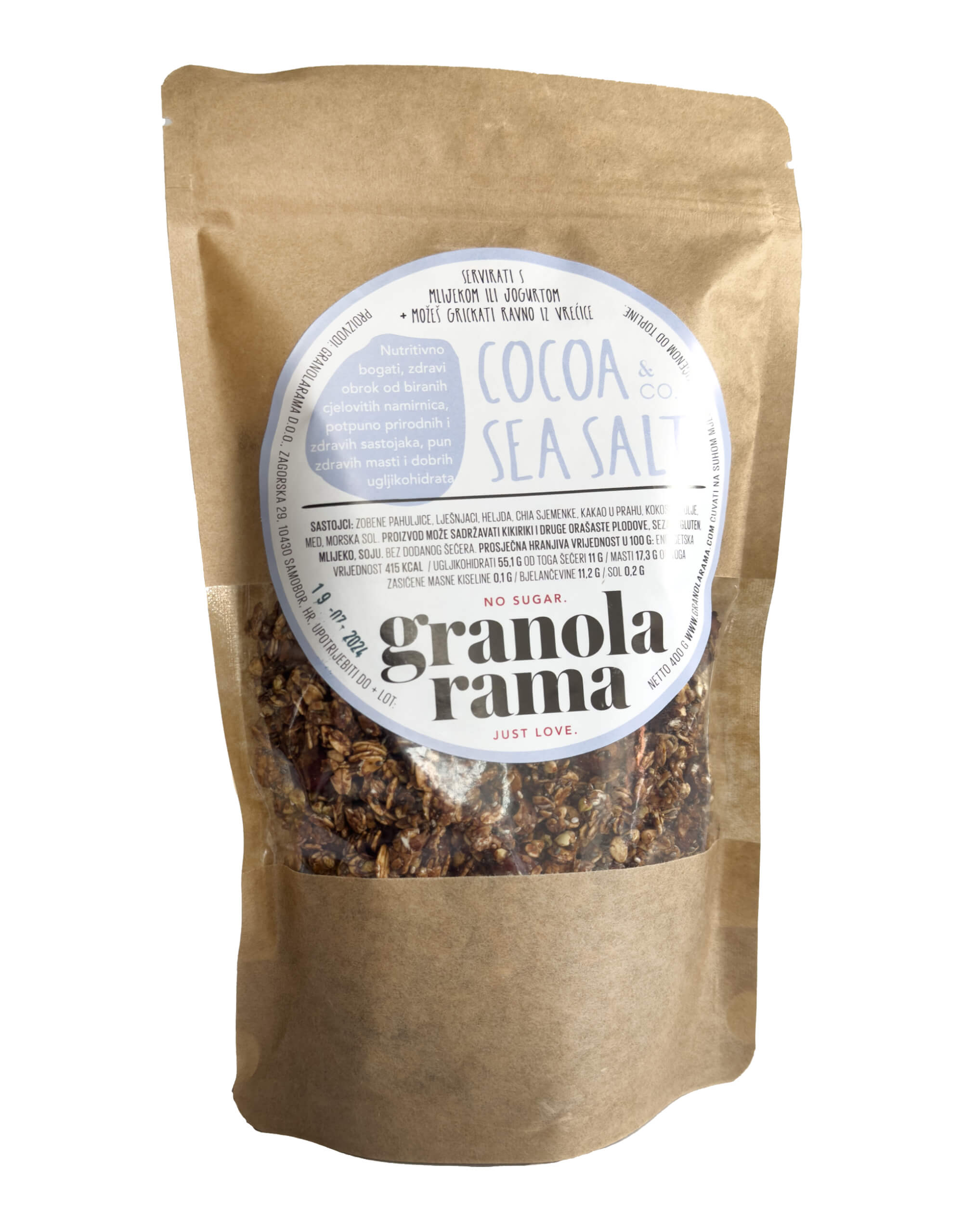 Cocoa Sea Salt granola rađena je od najfinijeg kakaa, cijelih lješnjaka, hrskave heljde i zdravih chia sjemenki.
