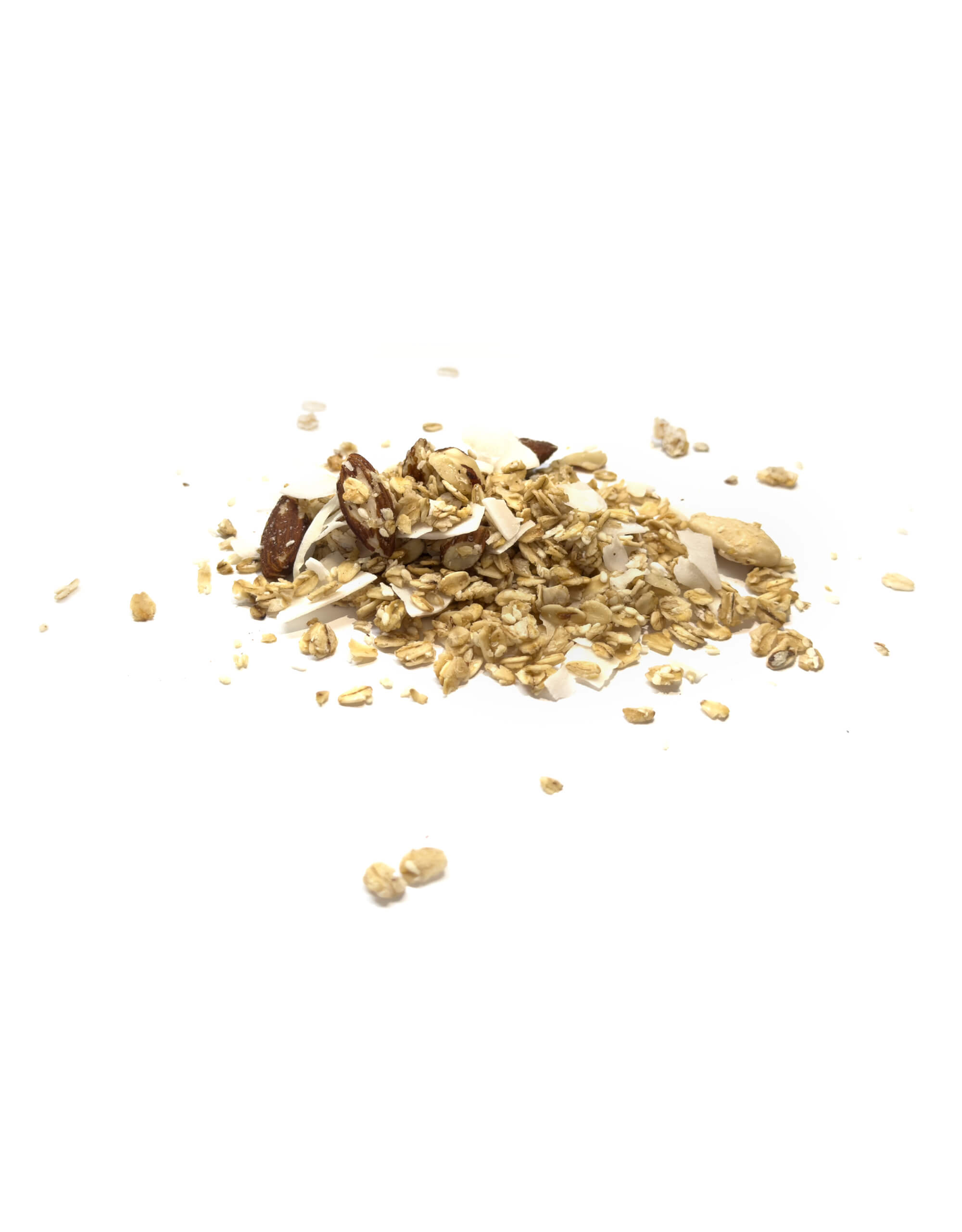 Sastojci: zobene pahuljice, blanširani bademi, bademi, lješnjaci, kokosov čips, naribani listići kokosa, sezam, kokosovo ulje, med, morska sol.