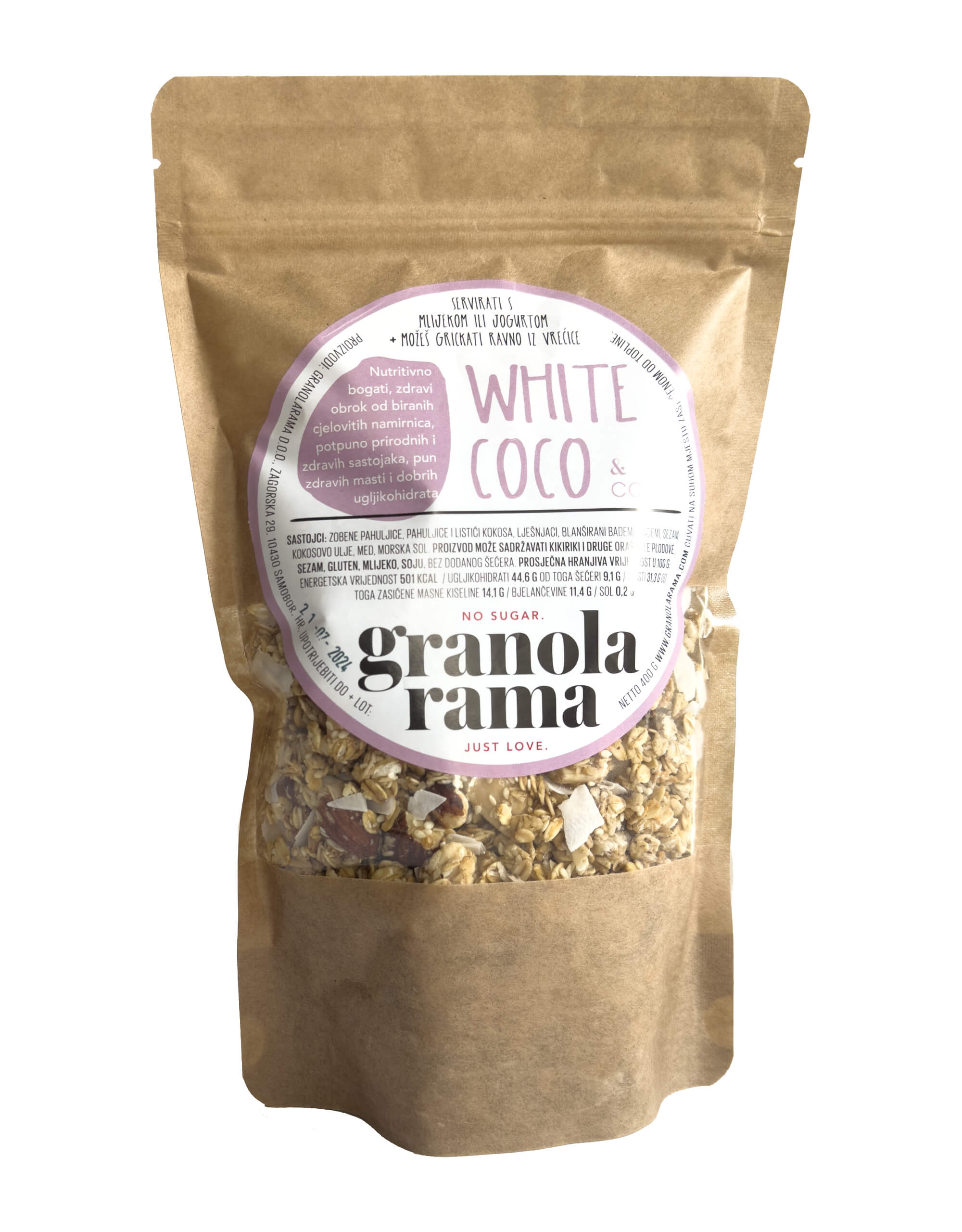 White coco granola miriše na kokos, bogata je kokosom, sezamom i orašidima.